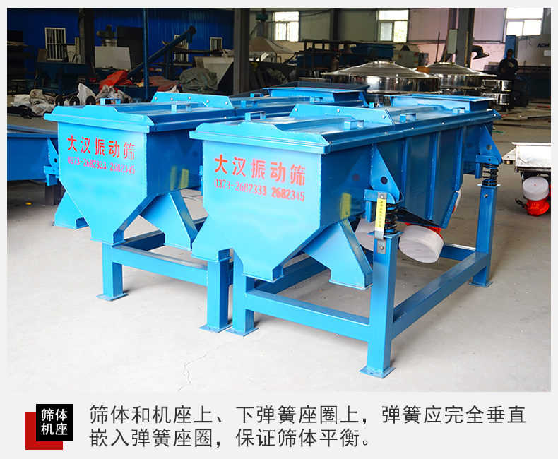 2、篩體和機(jī)座上、下彈簧座圈上,彈簧應(yīng)完全垂直嵌入彈簧座圈,以保證篩體平衡,篩機(jī)的振動部分切勿與機(jī)外其它物體有硬性連接或接觸。