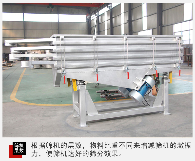 2,直線篩振動篩篩分面積廣,該設(shè)備從粉狀篩分到顆粒狀物料篩分都能完成同時還能夠篩分多種物料等級。