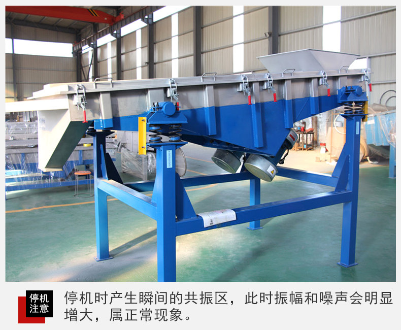 6、設(shè)備在停機(jī)時產(chǎn)生瞬間的共振區(qū),此時振幅和噪聲會明顯增大,屬正常現(xiàn)象,設(shè)備在開停機(jī)前,篩面上不得有存留物料,篩網(wǎng)需經(jīng)常檢查是否張緊、破損,如有破損要即時更換。