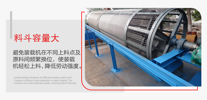 4.儲料斗容量大,使裝載機合理安排主設備(如攪拌站)與篩砂機的上料時間,避免裝載機在不同上料點 及原料間頻繁換位,使裝載機輕松上料,降低勞動強度。